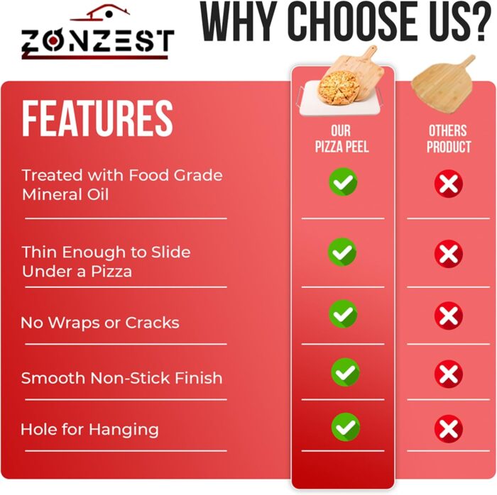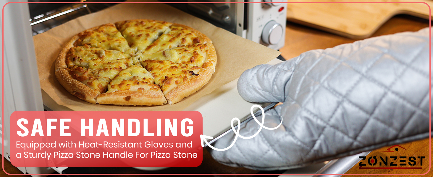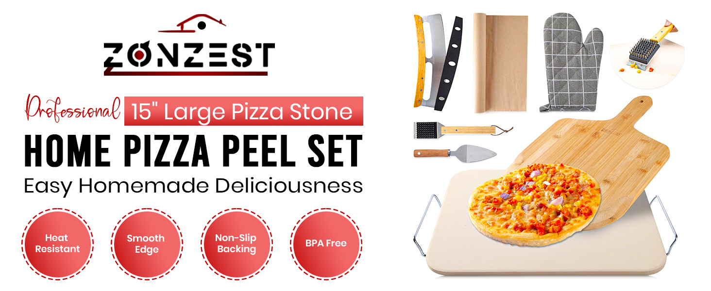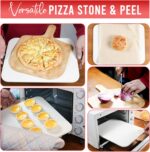 - 【8 PCS Convenience】 The ZONZEST ceramic pizza stone set has everything for perfect homemade pizzas. It includes a pizza stone handle, bamboo pizza peel, rocker cutter, pizza server, heat-resistant gloves, 10 parchment papers, and a stone scraper with a grill brush for easy cleaning. This all-in-one kit makes professional-quality pizza effortless!
