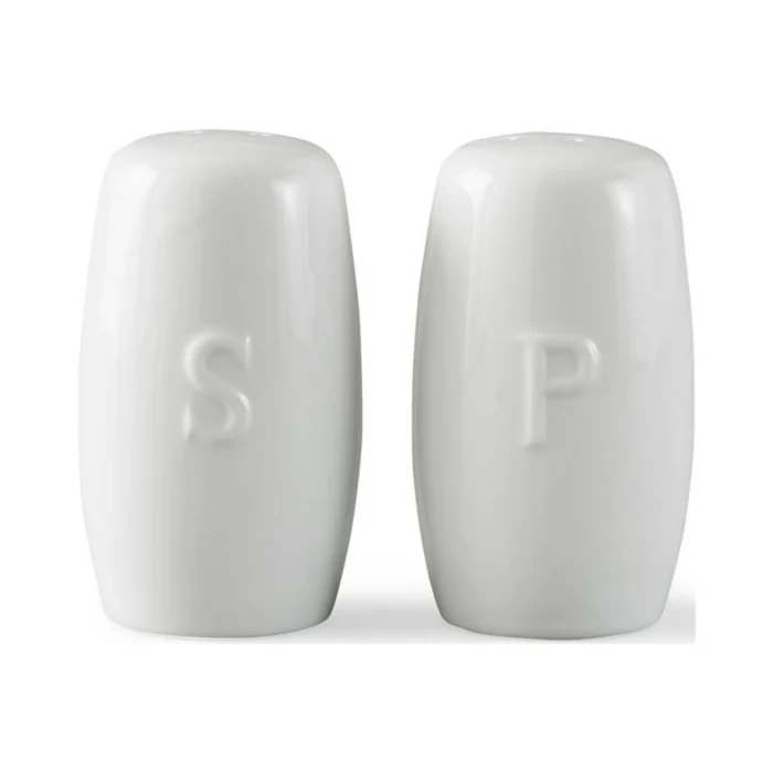 This is a porcelain salt and pepper set from Better Homes & Gardens has embossed letters with S on one shaker and P on the other. These salt and pepper shakers are white porcelain so they are durable.